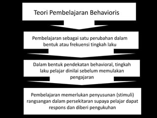 Mohamad Ridwan menerbitkan PENGAPLIKASIAN TEORI BEHAVIORISME DALAM PROSES PENGAJARAN DAN PEMBELAJARAN pada 2021-01-04. Pembelajaran merupakan istilah yang diambil dari terjemahan kata Instruction. Muat turun halaman 1-33 di AnyFlip.